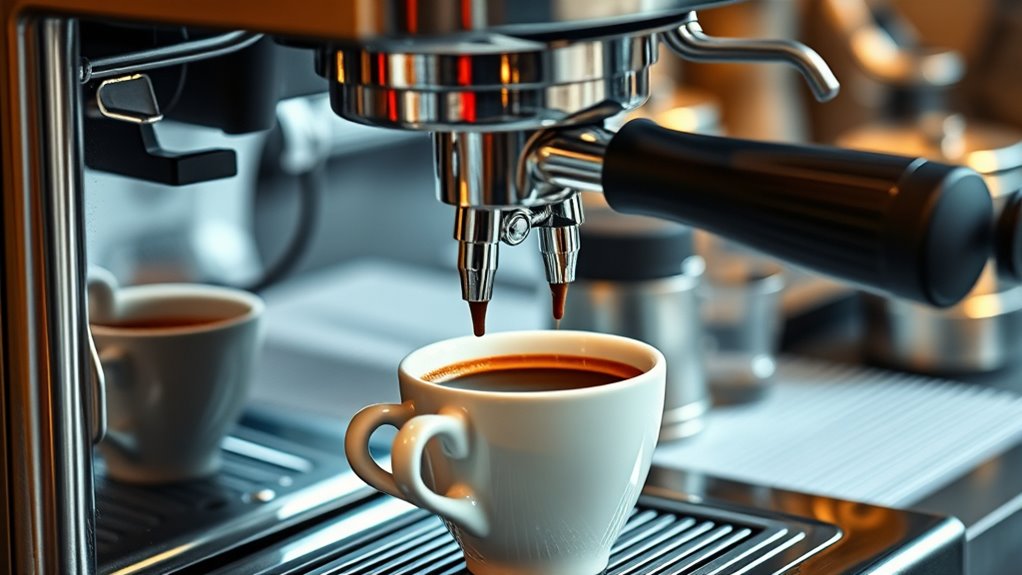 Choosing the right brewing pressure is vital because it directly impacts the flavor and quality of your espresso. Most machines operate best around 9 bars, which guarantees proper extraction of flavors without overdoing it. Many models offer pumps capable of 15 to 20 bars, giving more versatility and the ability to extract richer oils and aromas, resulting in a thicker crema. However, exceeding 20 bars doesn’t necessarily improve quality and can lead to over-extraction or bitterness if not carefully managed. Consistent pressure control is essential; a built-in gauge helps monitor and maintain ideal pressure. Some machines even allow you to adjust pressure settings, letting you tailor the brew to your coffee type or personal taste. Proper pressure management ensures a balanced, flavorful espresso every time.