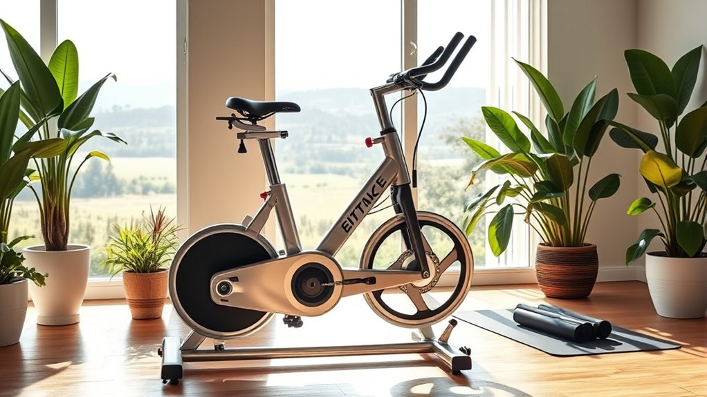 How can I make my workouts more engaging and effective? One key factor is connectivity and app support. Many modern exercise bikes come equipped with Bluetooth or Wi-Fi, allowing me to sync with popular fitness apps for real-time tracking and progress monitoring. I love how app support includes access to virtual routes and interactive training programs, which keep my motivation high. Compatibility with platforms like Zwift and Peloton means I can customize my workouts and immerse myself in detailed data analysis. Plus, some bikes feature built-in tablets or device mounts, making it easy to integrate entertainment. Regular updates ensure these bikes stay in tune with the evolving digital fitness world, enhancing my overall experience.