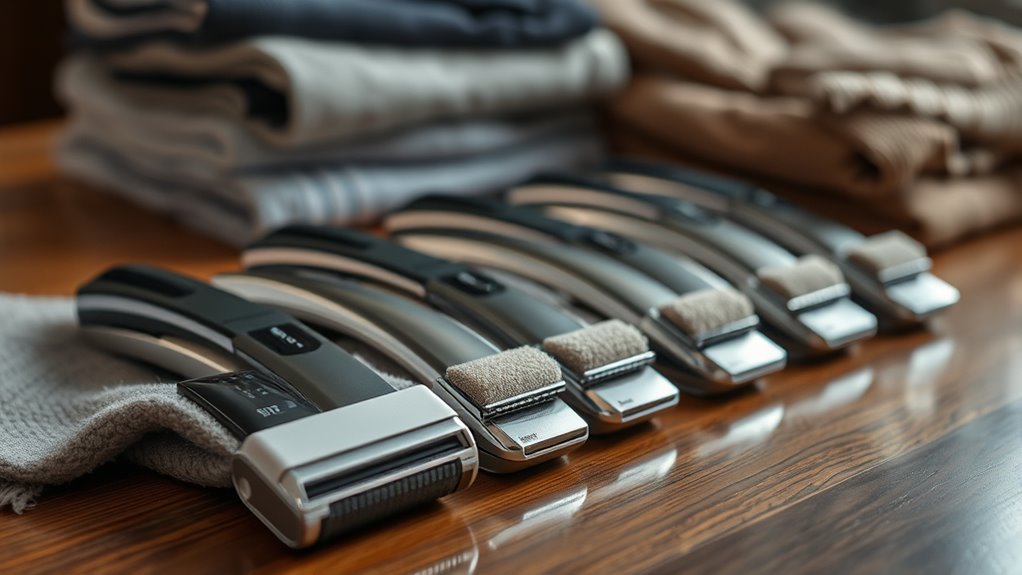 Safety features are a vital consideration to guarantee you use your fabric shaver confidently and without worry. Devices with automatic shut-off and blade locks help prevent fabric damage and protect you from accidental cuts. Protective mesh covers or guards ensure blades don’t come into direct contact with delicate fabrics, reducing snags or tears. Safety switches that deactivate the shaver if the cover or grid becomes loose add an extra layer of security. Many models also stop blades when the cover is open, preventing injuries and fabric damage. Additionally, features like non-slip grips and ergonomic designs provide better control during use, minimizing slips and accidents. Prioritizing these safety features helps you operate your fabric shaver safely and effectively, giving you peace of mind while maintaining your clothes.