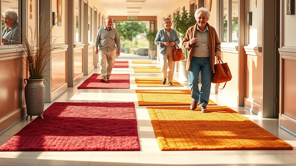 When choosing fall mats for the elderly, I focus on size and coverage to guarantee safety without restricting movement. I also consider impact absorption and slip-resistant features to prevent injuries. finally, I look for mats that are easy to clean and compatible with mobility devices for practical use.