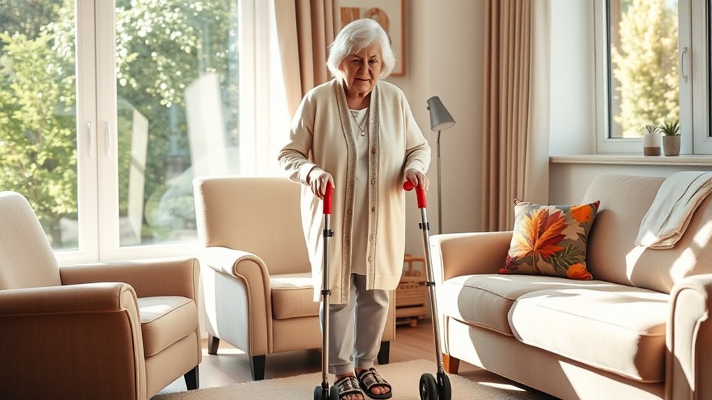 Safety features are vital when selecting fall prevention aids for seniors, as they directly impact stability and protection. Non-slip grips and textured handles help guarantee a secure hold, reducing the chance of slips. Many devices include motion sensors or alarms that alert caregivers if a senior tries to stand or leaves a safe zone, providing added oversight. Adjustable safety components, like height or width settings, allow a customized fit that enhances stability and minimizes accidental falls. Secure fastening mechanisms, such as metal buckles or locking straps, prevent the aid from detaching unexpectedly. Some aids also feature soft padding or impact-absorbing materials, cushioning falls and decreasing injury severity. These safety elements work together to create a reliable, secure environment for seniors, promoting confidence and independence.