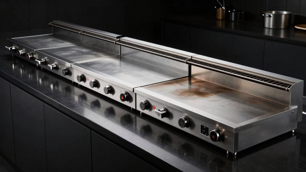 Considering the variety of fuel options available for flatgrills can seem overwhelming, but understanding their differences helps you select the best fit for your cooking style. Propane and natural gas are popular for outdoor use because they’re portable and deliver consistent heat, with BTU ratings indicating power. Electric flatgrills are perfect for indoor spaces or areas with gas restrictions, offering precise temperature control without emissions. Charcoal models give a distinct smoky flavor, but require more time for setup, cleanup, and temperature management compared to gas or electric options. When choosing a fuel type, think about availability, safety, installation requirements, and the kind of cooking experience you want. Your choice should match your outdoor or indoor setup and how much effort you’re willing to invest in prep and cleanup.