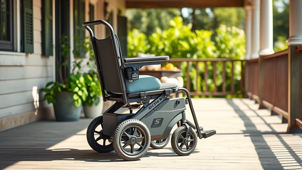 Battery life and range are essential factors to contemplate when choosing a folding electric wheelchair for seniors. The battery capacity, like 12Ah or 15Ah, directly affects how far you can go on a single charge. I recommend looking for rechargeable lithium-ion batteries, as they tend to last longer, charge faster, and are lighter than lead-acid options. It’s important to verify the estimated range per charge, which can vary from as little as 6 miles to over 25 miles, depending on usage and battery size. Additionally, check if the battery is removable for easy charging—this is especially helpful for those with limited mobility. Ensuring the wheelchair supports your daily activities and planned outings means less worry about recharging and more confidence in your independence.