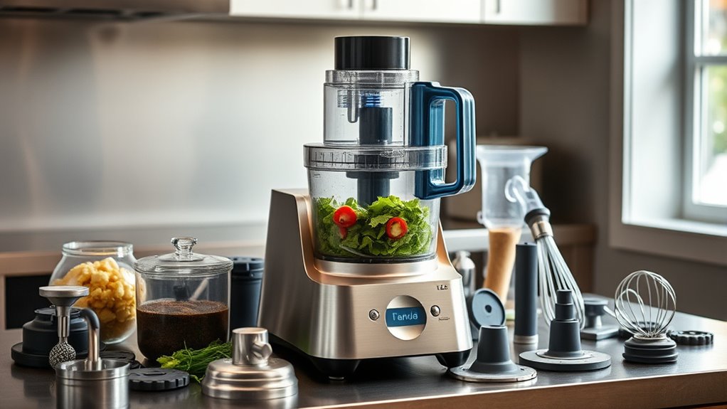 A key factor in selecting a commercial food processor is its versatility, which is largely determined by the range of disks it offers. Multiple cutting disks, such as shredding, slicing, and dicing, allow me to handle a variety of prep tasks efficiently. Detachable disks make cleaning simple and switching between functions quick, saving valuable time. Having different disk sizes, like 2mm or 7mm, provides precise control over food thickness and texture, ensuring consistent results. A exhaustive set of disks helps streamline workflows by reducing the need for separate appliances, making the process more efficient. Interchangeable disks also enable me to process a wide range of ingredients, from soft cheeses to hard vegetables, expanding the machine’s capabilities and making it a versatile tool in my commercial kitchen.