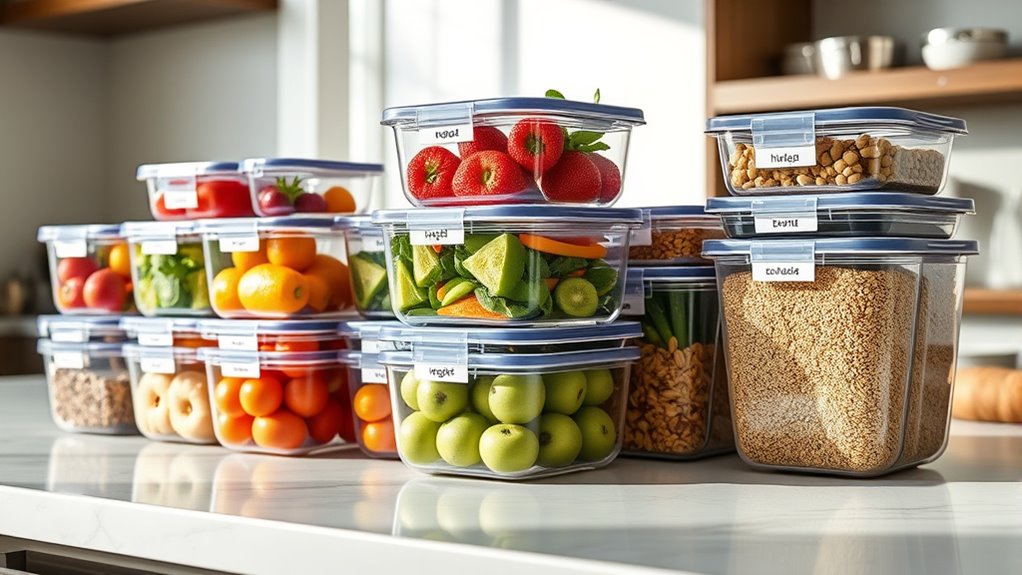 Are you making the most of your storage space? Choosing containers with a space-saving design makes a big difference. I look for stackable or nesting options that maximize vertical and horizontal space, helping me keep cabinets tidy. Compact containers with uniform sizes fit neatly together, making organization effortless. Modular designs that interlock or stack securely reduce clutter and make the most of every inch. Clear containers are a bonus—they let me see what’s inside instantly without opening each one. Plus, containers with flat or snap-on lids help me stack multiple units more securely, further optimizing storage. Overall, selecting space-efficient containers means I can store more in less space, keeping my kitchen organized and accessible.