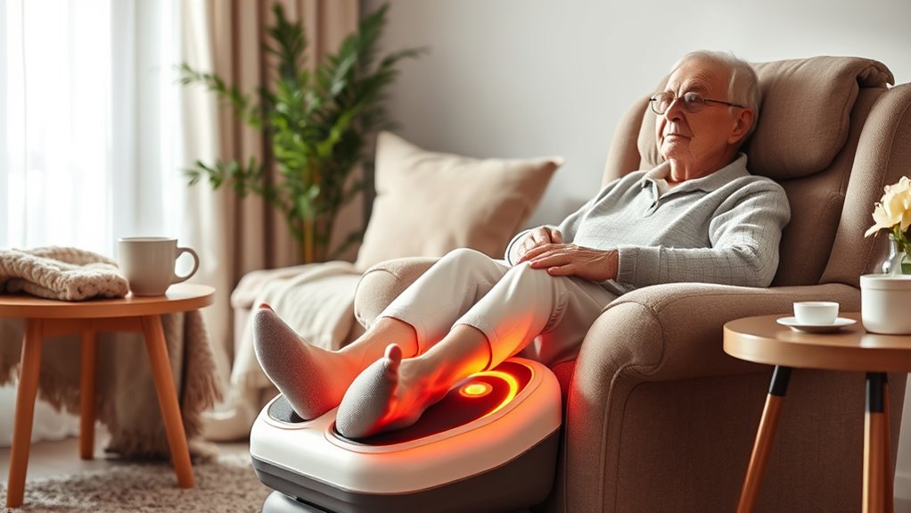 Safety features are crucial to guarantee that elderly users can enjoy a foot massage without risking injury or accidents. I look for devices with automatic shut-off timers, usually set for 15-30 minutes, to prevent overheating and overuse. A stable, non-slip base ensures secure footing and minimizes falls during operation. Adjustable intensity levels allow me to customize the massage strength, avoiding discomfort or excessive pressure. If heating functions are included, I prefer models with temperature controls and safety shut-offs to prevent burns. Easy-to-use controls, like large buttons or remote controls, are essential so I can operate the massager confidently without confusion. These safety features give me peace of mind, knowing I can relax and enjoy the benefits without worry.