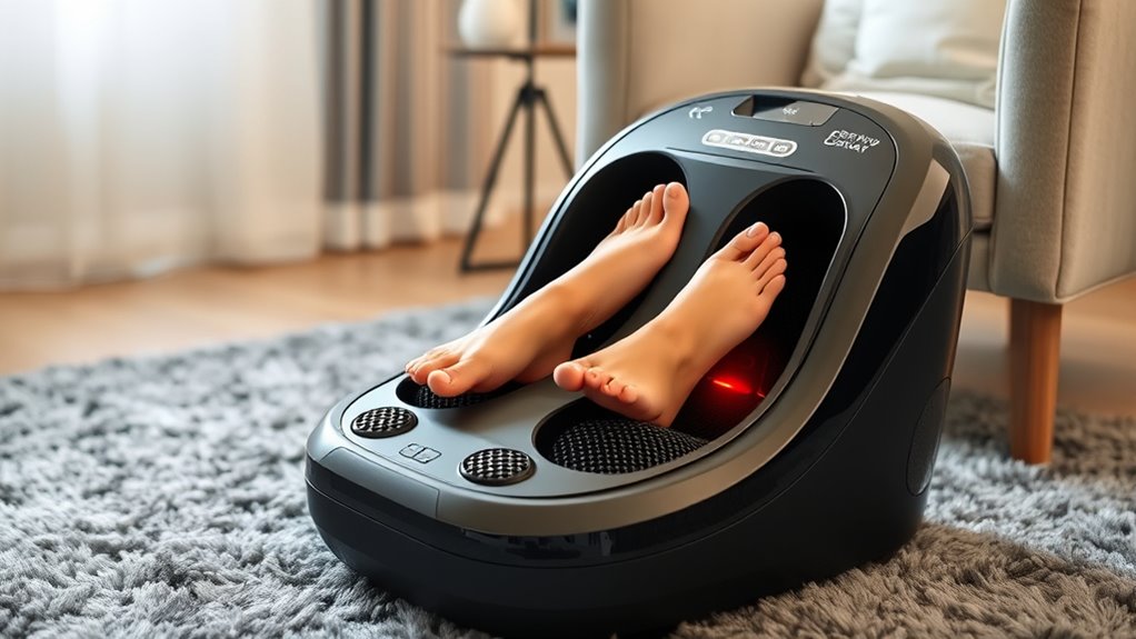 When selecting a foot massager, being able to adjust the intensity levels can make a big difference in your comfort and overall experience. Multiple options like low, medium, and high settings let you customize the massage to your preferences and needs. If your feet are sensitive or you’re recovering from an injury, lower settings provide gentle relief, while higher levels deliver a deeper massage for muscle tension. Variable intensity also allows you to gradually increase pressure as your muscles loosen, enhancing relaxation. Many models feature intuitive controls or remote controls, making it easy to switch between levels without interrupting the massage. This flexibility guarantees you can tailor each session, making your foot massage both effective and comfortable, no matter your specific requirements.
