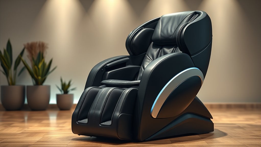 Selecting a full-body massage chair that offers extensive customization options guarantees you get a personalized and effective massage experience. I look for chairs with multiple automatic and manual modes, so I can choose techniques like kneading, tapping, or shiatsu based on my mood. Adjustable settings for intensity, width, and speed let me tailor the massage to my comfort level. I also prioritize chairs with body scan technology that detects my shape and adjusts the massage accordingly, ensuring maximum effectiveness. The ability to create and save personalized programs is a big plus, making it easy to access my preferred settings. Additionally, features like adjustable zero gravity positions, heat therapy, and airbags targeting specific areas allow me to customize my relaxation further, making the experience truly my own.