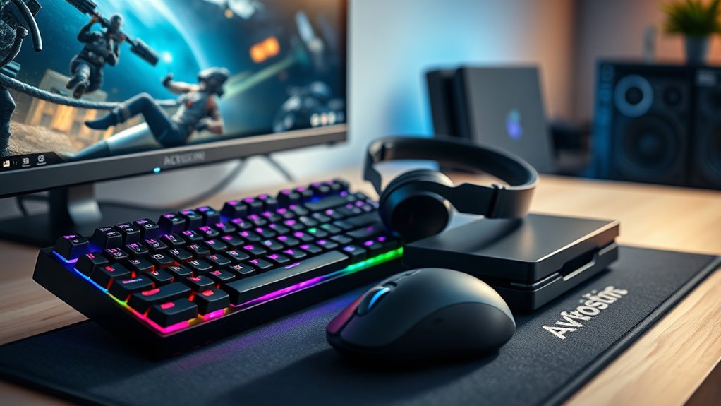 Choosing the right gaming accessories can make or break your gaming experience, especially in 2025 when device compatibility is vital. First, I always make certain that the accessories I choose are compatible with my specific gaming devices—whether it’s a console, PC, or mobile phone. Checking connection types like Bluetooth, USB, or a 3.5mm jack is essential to match the ports on my devices. I also confirm that the accessories support the latest models and firmware updates released in 2025 to avoid any hiccups. If I play on multiple devices, I look for cross-platform compatibility to guarantee smooth switching. This way, I can enjoy seamless gameplay without worrying about whether my gear will work with my favorite systems!