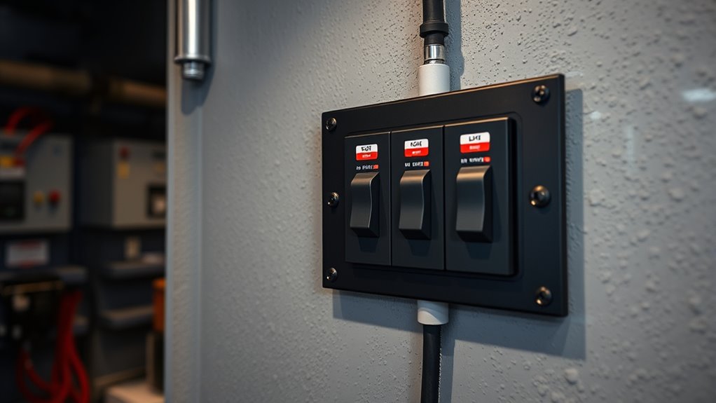 Imagine a vigilant guardian watching over your power supply—automatic transfer switches need regular care too. I check the control panel for any error codes, inspect connections for corrosion, and test the switch’s operation periodically. Cleaning contacts and lubricating moving parts keep everything functioning smoothly. I also review manufacturer guidelines annually to guarantee my switch remains reliable, so I can trust it to protect my home when the power fails.