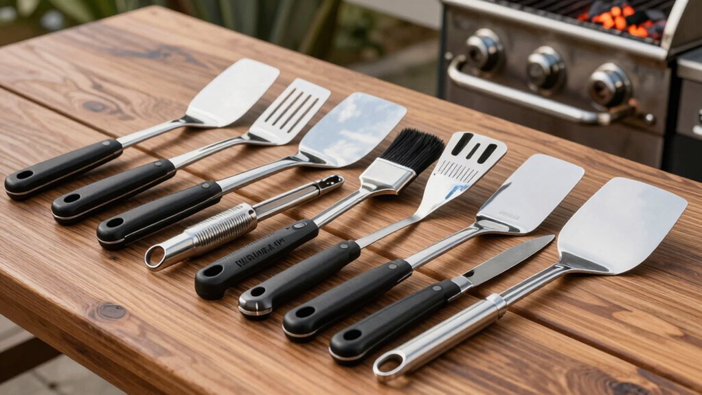 A well-designed stainless steel grill tool set offers more than just durability; it provides the versatility needed to handle a variety of grilling tasks with ease. I look for sets that include a range of tools like spatulas, tongs, forks, and brushes to cover all my needs. Multi-functional tools, such as spatulas with built-in bottle openers or knives that double as flippers, save space and add convenience. Tools with adjustable or lockable features, like tongs with locking mechanisms, enhance safety and make storage simpler. Long-handled utensils help me keep a safe distance from heat while giving better control. Additionally, having specialized tools like meat thermometers, skewers, and basting brushes allows me to tackle different cooking techniques efficiently.