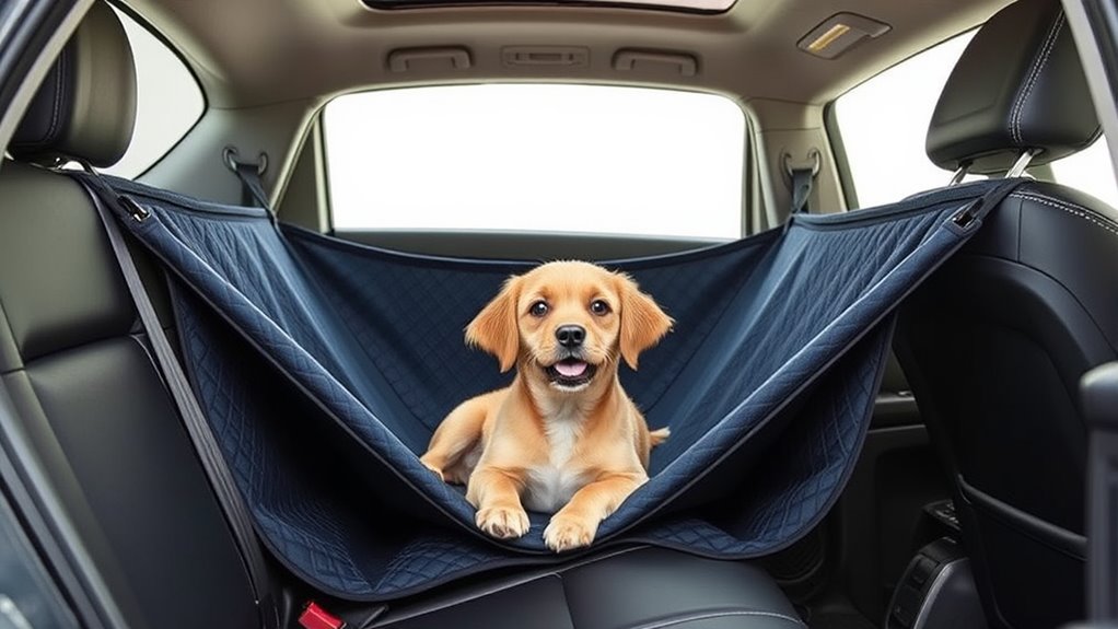 Ensuring your hammock-style pet car seat cover fits well starts with understanding how it interacts with your vehicle’s specific interior. First, measure your backseat to confirm the cover’s dimensions are suitable. Adjustable straps and seat anchors help customize the fit, so check if those features are present. Compatibility with different vehicle types—sedans, trucks, SUVs, and crossovers—is vital, so look for designs that accommodate various interior layouts. Universal fit features like elastic edges or adjustable buckles can make installation easier across multiple models. Additionally, verify that attachment points, such as headrest straps and side flap buckles, align with your seats and doors. This guarantees a secure fit, keeps your pet safe, and maintains the cover’s effectiveness regardless of your vehicle type.