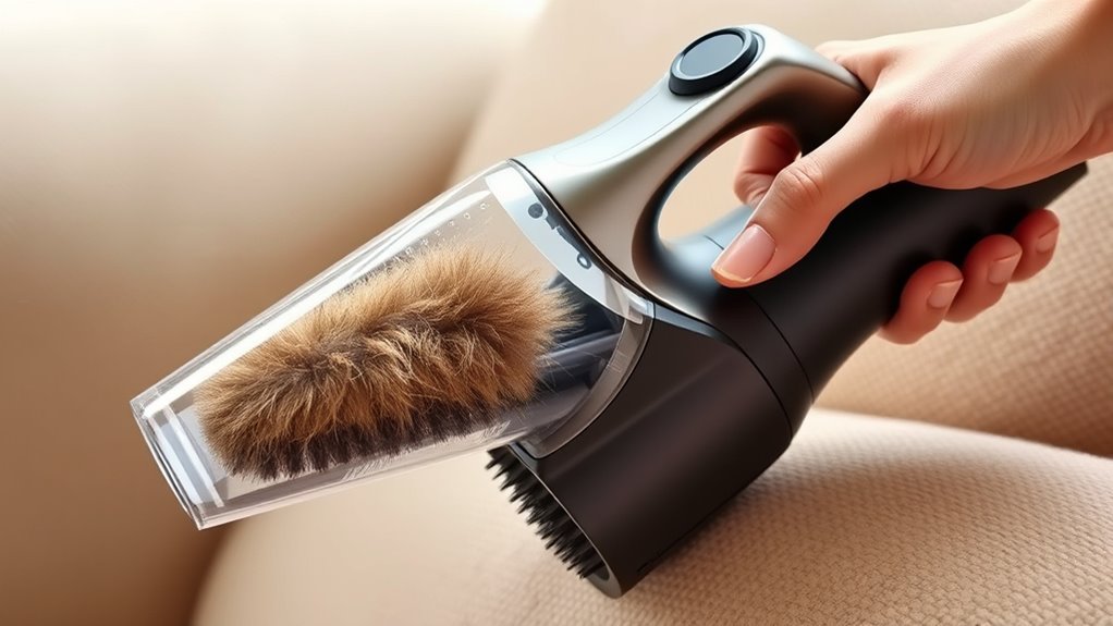 Choosing a handheld pet-hair vacuum that’s easy to use and portable makes cleaning upholstery less of a hassle. Lightweight models, weighing between 1.4 to 3 pounds, are simple to carry and maneuver around furniture. Cordless designs eliminate the inconvenience of cords, giving me the freedom to move around without restrictions. Features like ergonomic grips, compact size, and one-touch controls make quick work of cleaning sessions—no complicated setups needed. I also appreciate integrated LED lights that help me spot hidden pet hair in dark corners. Reusable filters and easy-empty dust cups cut down on maintenance, so I can focus more on cleaning and less on fussing with parts. Overall, these features make handheld vacuums a convenient, user-friendly choice.