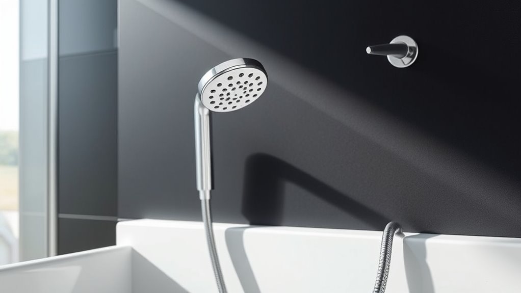 The variety of spray modes available on handheld shower heads substantially impacts your overall shower experience. With options like rain, massage, mist, jet, and water-saving pause, you can customize your shower to suit your mood or needs. Multiple spray modes enhance comfort and relaxation, whether you want a gentle mist or a powerful rinse. Some models even offer up to 10 different patterns, making them versatile for cleaning, pet bathing, or everyday showering. Switching modes is usually simple, often through rotating handles or push buttons, which makes adjusting effortless. Having multiple spray options means you can tailor your water flow for maximum comfort, efficiency, or cleaning power. This versatility allows you to create a personalized, enjoyable, and functional showering experience every time.