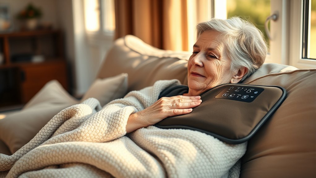 Heating pads prevent burns in elderly users by incorporating adjustable temperature controls, automatic shut-off features, and low-heat settings. I always recommend choosing pads with these safety measures, so you don’t have to worry about overheating or prolonged exposure. It’s also smart to use a cover or towel between the pad and the skin, and never leave it on unattended. These precautions help make certain of safe, comfortable relief.