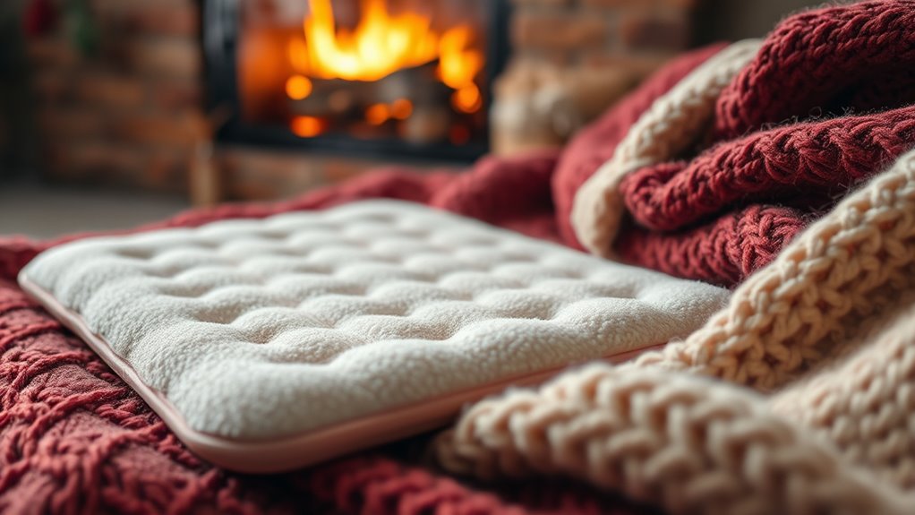 Safety features are crucial considerations because they help prevent accidents and injuries during use. Auto shut-off timers are essential, as they prevent overheating and reduce burn risks during extended sessions. Overheat protection mechanisms monitor temperature levels continuously and cut power if safe limits are exceeded, adding peace of mind. Certified heating pads with UL or ETL approval ensure the device meets strict safety standards, giving you confidence in its reliability. Non-slip and secure fastening options keep the pad in place, minimizing accidental contact with hot surfaces. Additionally, features like cool-touch exterior surfaces and moisture control further enhance safety, preventing burns and ensuring safe operation. Prioritizing these safety features helps you enjoy the warmth without worry.