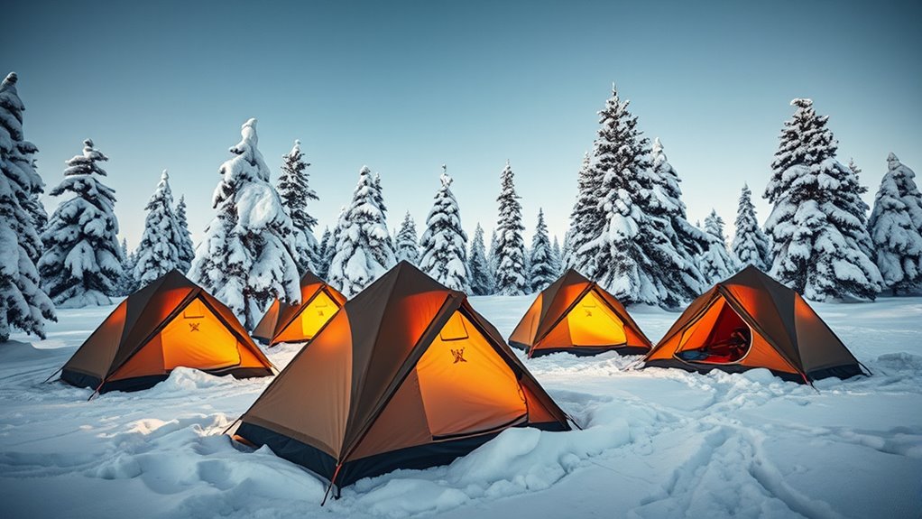 To stay warm in freezing conditions, I prioritize tents with integrated insulation in the walls, floors, and roofs, which help trap heat effectively. Many heavy-duty winter tents feature insulated materials or add-on options like foam panels, reflective liners, or double-layer fabrics with thermal barriers. These enhancements considerably improve heat retention. Proper ventilation is also essential; it prevents condensation buildup that can sap warmth and affect air quality. Additionally, tents with stove jacks or compatibility with portable heaters boost warmth during extreme cold. High-quality fabrics rated for low temperatures, such as PU3000mm waterproof materials with reinforced seams, prevent heat loss and keep the interior cozy. Combining insulation with these features ensures a more comfortable and warmer winter camping experience.