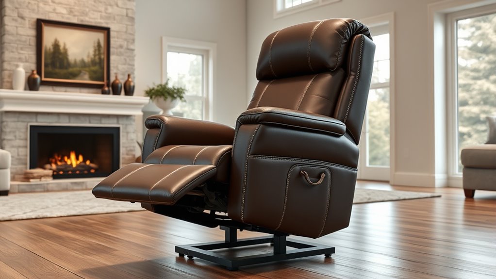 Choosing the right heavy-duty lift recliner means paying close attention to its weight capacity. Most models support between 350 to 600 pounds, ensuring they can safely hold larger users. It’s essential to check the manufacturer’s specified weight limit so you don’t risk overloading the chair. Exceeding this limit can compromise safety features and damage the structure. Higher capacity models often have reinforced frames and stronger lift mechanisms to handle more stress reliably. Selecting a recliner with an appropriate weight capacity maximizes safety, comfort, and the chair’s lifespan. Don’t assume a chair can handle more than its rated limit; always verify the specifications to make a smart, durable choice that suits your needs.