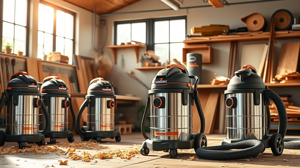 When searching for the best high-CFM shop vacuums, I’ve found that models like the VEVOR Stainless Steel (6 Peak HP) and DEWALT DXV10S-QT (10 Gallons) stand out for their power and versatility. These vacuums offer excellent suction capabilities and various features that make cleanup easier in any workshop. A good vacuum balances capacity and mobility. If you’re curious about more specific recommendations and factors to contemplate, stick around for further insights.