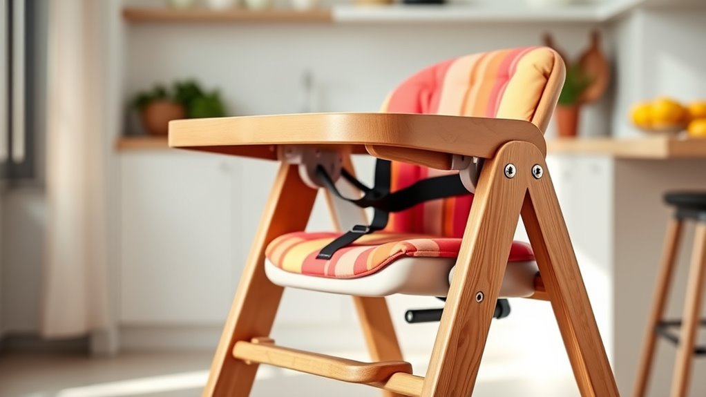 Adjustability for growth is essential because children grow quickly and their needs change. A good foldable high chair should have multiple height settings to match different table heights and guarantee ergonomic comfort. Look for models with adjustable footrests to support proper posture and add comfort during meals or play. A reclining backrest offers versatile positioning, making it easier to feed, rest, or relax your child. Convertible high chairs that transition from infant to toddler sizes are ideal—they grow with your child, eliminating the need for a new chair. Additionally, easy-to-use, tool-free adjustment mechanisms make it simple for parents to modify the chair’s settings as their child develops, guaranteeing continued comfort and proper support throughout different stages.