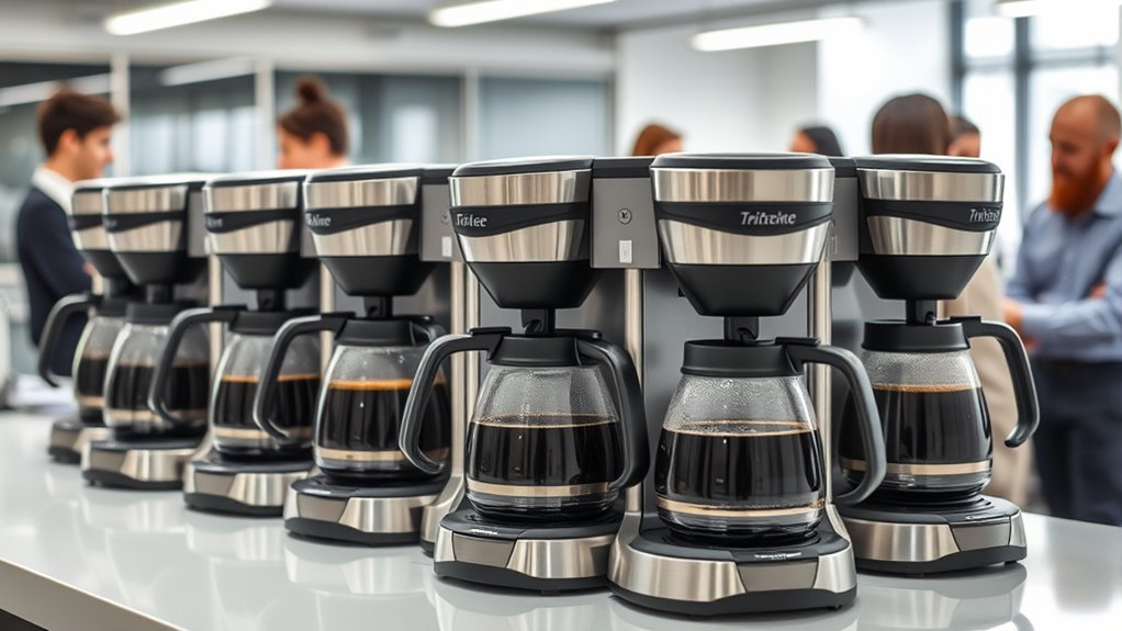 Think of these coffee makers as reliable friends—replacement parts and filters are like their trusted tools, easily found at most stores or online. I’ve discovered that brands like Bunn and Hamilton Beach have excellent availability, ensuring your office stays caffeinated without interruptions. So, rest assured, when it’s time for a filter change or part replacement, you won’t have to search far—support is just a quick click or trip away.