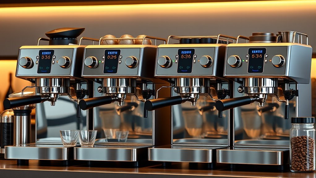 Advanced brewing technology is essential in high-end espresso machines under $2,000 because it directly impacts the quality and consistency of your espresso. Features like PID temperature control ensure precise heat management, preventing fluctuations that can affect flavor. Pre-infusion gently moistens coffee grounds before extraction, enhancing aroma and body. High-pressure pumps, typically between 15-20 bars, deliver ideal extraction for rich crema. Built-in grinders with adjustable settings or compatibility with pre-ground coffee promote freshness and consistency. Dual boiler or heat-exchange systems allow simultaneous steaming and brewing, saving time and improving workflow. Rapid heat-up technologies like thermocoils or thermojets provide quick recovery and stable temperatures. Additionally, pressure gauges, digital displays, and customizable brewing parameters give you control to fine-tune every shot for barista-level quality.