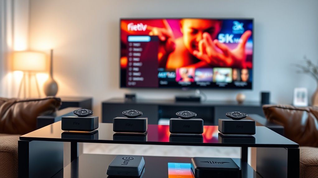 If you’re looking for the best high-end Fire TV streaming devices in 2025, I recommend considering options like the Fire TV Cube with its powerful octa-core processor, 4K HDR visuals with Dolby Vision and Atmos, and Wi-Fi 6E support. The Fire TV Stick 4K Max also offers impressive performance in a compact design. For a premium experience, devices with advanced remote controls and smart home features stand out. Keep exploring to find out which device suits your needs perfectly.
