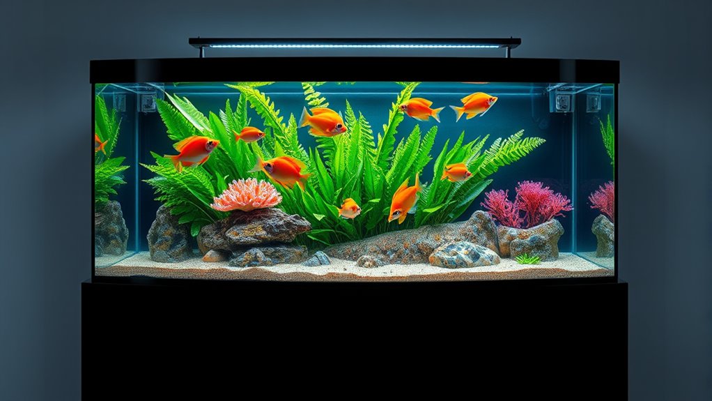 Imagine crystal-clear water swirling effortlessly as advanced filtration systems work behind the scenes. They remove waste, excess nutrients, and toxins, creating a pristine environment. I’ve seen how these systems keep water balanced, preventing harmful spikes and algae blooms. They promote healthier fish, vibrant colors, and longer life. With efficient filtration, I feel confident knowing my aquarium is a stable, beautiful ecosystem where aquatic life thrives naturally and effortlessly.