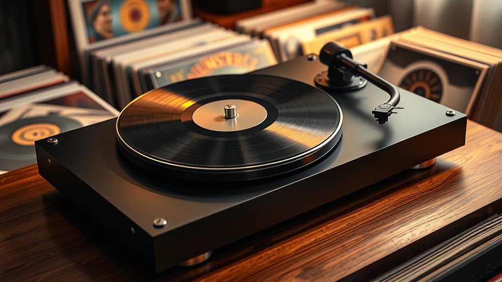 Think of your premium turntable as a fine instrument—it needs proper care to perform at its best. I regularly clean the stylus and records, check and tighten connections, and keep the platter dust-free. Occasionally, I lubricate moving parts and replace the belt if needed. This routine maintenance guarantees your high-end player maintains its pristine sound quality and longevity, much like tuning a valuable musical instrument for peak performance.