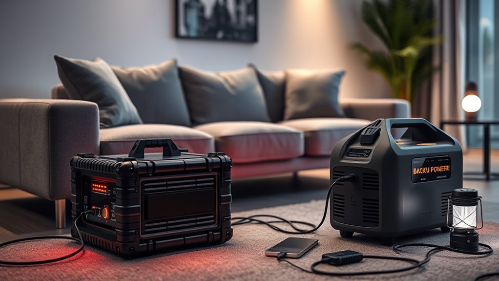 Think of safety features as your home’s invisible shield. I look for automatic shut-off systems that prevent overloads, circuit breakers that trip during faults, and grounding to avoid shocks. Surge protectors are essential too, guarding against power spikes. These features work silently, ensuring I stay safe without constantly monitoring. Prioritizing these makes your backup system reliable and safe, so you can rest easy knowing your home is protected during outages.