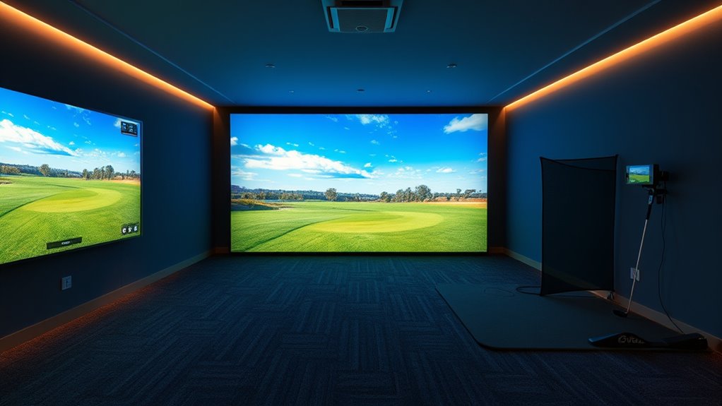 Choosing the right space for your home golf simulator is crucial to guarantee safe and effective practice. I recommend a room with a minimum ceiling height of 9 feet to comfortably accommodate your swing and equipment. Measure the available floor space to ensure it can fit the enclosure, typically around 10×8 feet or larger, for safe hitting. It’s also important to contemplate the room’s width and depth to allow for adequate distance and prevent balls from leaving the hitting area. Make sure there’s enough clearance around the setup for easy assembly, maintenance, and unobstructed swings. Finally, verify that the overall room size can support both the enclosure and additional gear like projectors or launch monitors without feeling cramped. Proper space ensures safety and ideal practice conditions.