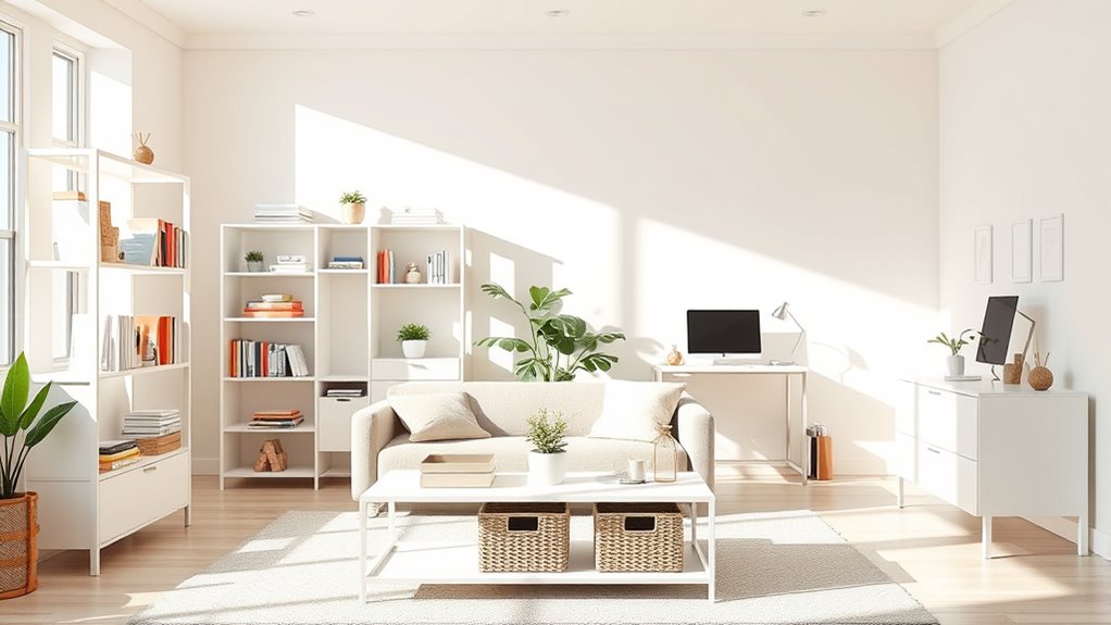To prevent clutter from returning after organizing, I stay disciplined about what I bring into my space. I regularly evaluate my belongings and set rules for new items, like the one-in-one-out rule. I also create designated spots for everything, making it easier to maintain order. Daily tidying routines help too; I spend just a few minutes each day putting things back in their place. It keeps my space feeling organized and clutter-free!