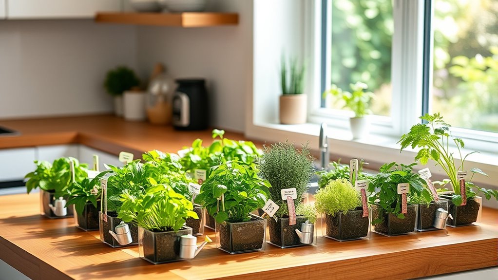 Choosing the right herbs for your indoor garden depends on matching the seed varieties to your culinary tastes and growing conditions. I look for kits that include a variety of herbs I enjoy cooking with, like basil, parsley, thyme, and mint, to guarantee versatility. I also prioritize seed packs that are heirloom, non-GMO, and organic, as these tend to have higher germination rates and produce healthier plants. Checking the seed packaging and instructions is essential for clarity, especially if you’re new to gardening. I also verify germination success guarantees and seed freshness to assure a reliable start. By selecting diverse, high-quality seed options, I can enjoy fresh flavors in my dishes and create a beautiful, thriving indoor herb garden.
