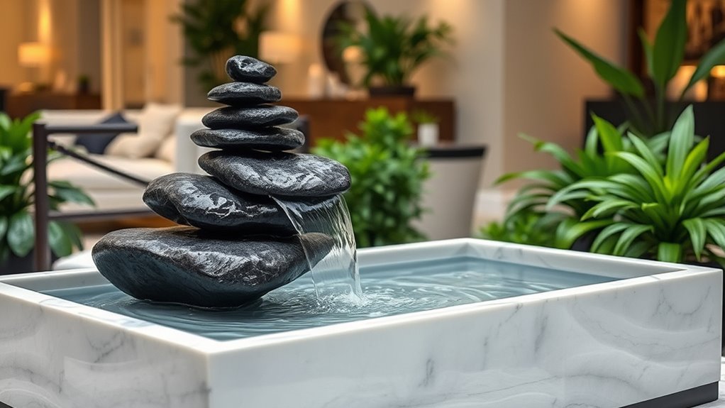 Water flow style considerably influences both the visual appeal and the calming effect of an indoor fountain. Gentle trickles and cascades create a serene, soothing atmosphere, while more vigorous streams add energy and movement. The flow style affects how water moves over surfaces, impacting noise levels, splashing, and overall ambiance. Adjustable flow pumps give me the flexibility to customize water speed, shifting from soft, subtle flows to lively, dynamic ones. Open-style basins support wider, dispersed flows that produce a calming, wide-ranging soundscape, whereas tiered or sculpted designs focus water along specific paths, emphasizing visual detail. Keep in mind, more vigorous flows may increase splashing and maintenance needs. Choosing the right flow style depends on the desired mood and your willingness to manage water movement.