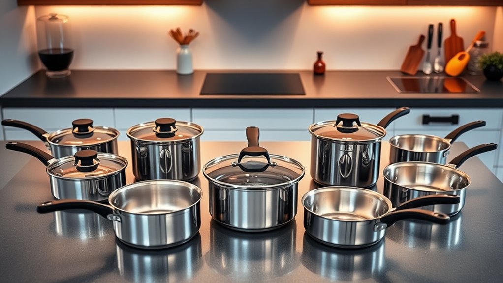 Like a gust of fresh air, eco-friendly cookware options are increasingly available. I find many sets made from sustainable materials like recycled stainless steel, ceramic, and eco-conscious coatings. These choices don’t just help the planet—they also perform beautifully, combining style and function. If you’re looking to cook responsibly without sacrificing performance, look for brands committed to sustainability; they’re making it easier than ever to go green in the kitchen.