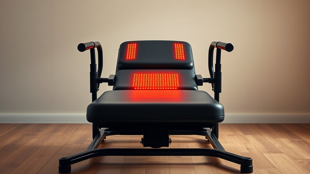 Adjustable heat settings are essential for customizing your therapy experience and guaranteeing ideal back relief. They let you control the warmth level during inversion, targeting specific areas like the lumbar or back muscles. Multiple heat levels can boost blood flow and promote muscle relaxation, making your sessions more effective. Being able to fine-tune the heat intensity helps you match your comfort preferences and sensitivity, preventing discomfort or overheating. Some inversion tables automatically select the optimal heat level, while others require manual adjustments, giving you precise control. Properly using adjustable heat settings can extend the duration of your sessions and enhance their benefits, all while maintaining safety and comfort. This feature ensures you get personalized relief tailored to your needs.