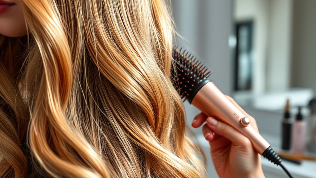 If you’re looking to boost volume and achieve a sleek, shiny finish fast, ionic hot-air brushes are a game-changer. They reduce frizz, lock in moisture, and style without damage, making hair look polished and healthy. From the Revlon One-Step to the Wavytalk Blowout Boost, there’s a versatile option for every hair type and length. Keep going, and I’ll share tips on choosing the perfect tool for your needs.