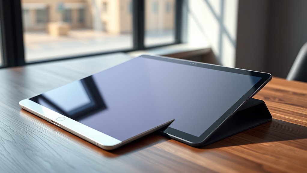 Choosing the right display size and quality depends on how I plan to use my iPad. The iPad Pro offers an 11-inch Liquid Retina XDR display with a resolution of 2420×1668, delivering exceptional brightness, contrast, and HDR capabilities—perfect for professional visuals and media editing. Its ProMotion technology with a 120Hz refresh rate makes scrolling smooth and responsive. Meanwhile, the iPad Air also has an 11-inch Liquid Retina display with True Tone and P3 wide color, providing vibrant, accurate colors ideal for creative tasks. While both screens are high-resolution, the Pro’s XDR technology enhances HDR content and contrast, making it better suited for detailed visuals and media consumption. Your choice hinges on whether you prioritize superior display quality or a more balanced, vibrant experience.