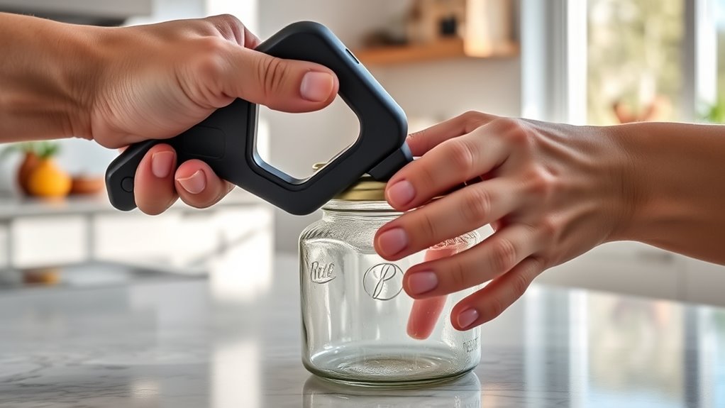 Choosing a jar opener for arthritis means paying close attention to grip strength requirements, since many traditional tools can be difficult to operate with weak hands. I look for devices that require minimal force to open jars, which helps prevent strain and fatigue. Ergonomic handles and leverage mechanisms are game-changers, as they make opening easier without needing a strong grip. Some models feature deep teeth grips or adjustable settings, ensuring a secure hold without excessive squeezing or twisting. For maximum ease, I consider electric or automatic openers that eliminate manual effort altogether. The key is selecting a tool that performs effectively with little to no manual squeezing or force, making kitchen tasks safer and less frustrating for those with limited grip strength.
