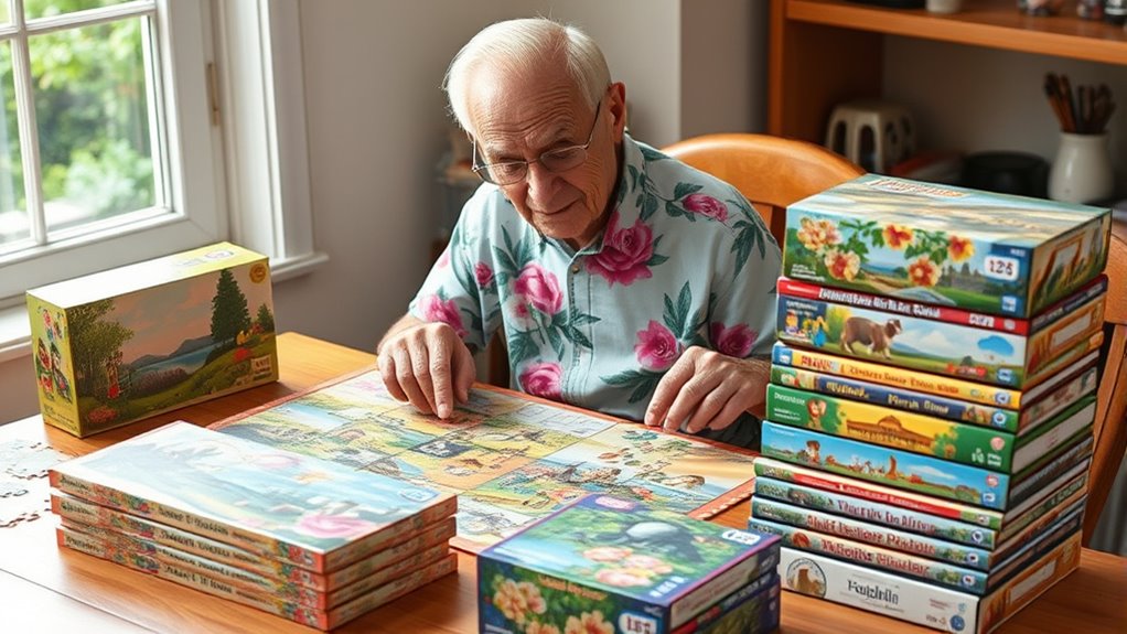 You’d think larger puzzles would be a hassle, but honestly, they’re a godsend. Bigger pieces reduce strain and frustration, making it easier for the elderly to grasp and manipulate. Smaller puzzles can feel like trying to solve a Rubik’s Cube with shaky hands, while larger ones turn into a satisfying, manageable challenge. So, yes, puzzle size really does matter—favoring larger pieces boosts comfort and accessibility effortlessly.