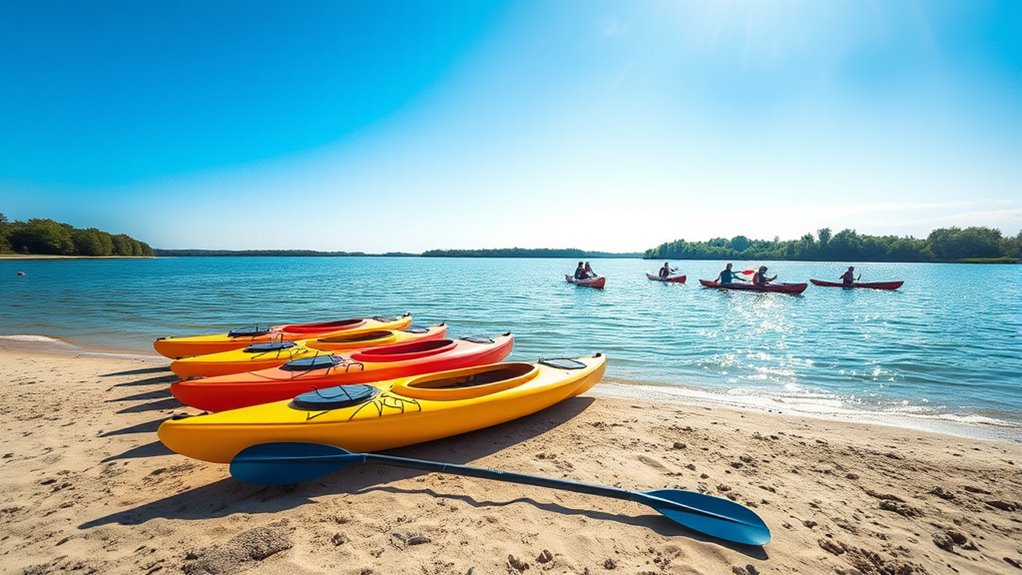 Choosing the right hull shape can substantially impact your kayaking experience, especially as a beginner. I’ve found that a flat or multi-chine hull offers enhanced stability, which is essential when you’re just starting out. These designs help me maintain balance on the water, making it less intimidating. Wide hulls are also a great option; they increase initial stability and greatly reduce the chance of tipping. While V-shaped hulls improve speed and tracking, they can compromise stability, making them better suited for more experienced paddlers. Remember, a hull with a flatter bottom or multi-chine profile provides a smoother, more stable ride—perfect for easing the learning curve. Prioritizing stability over agility is key when choosing your first kayak.