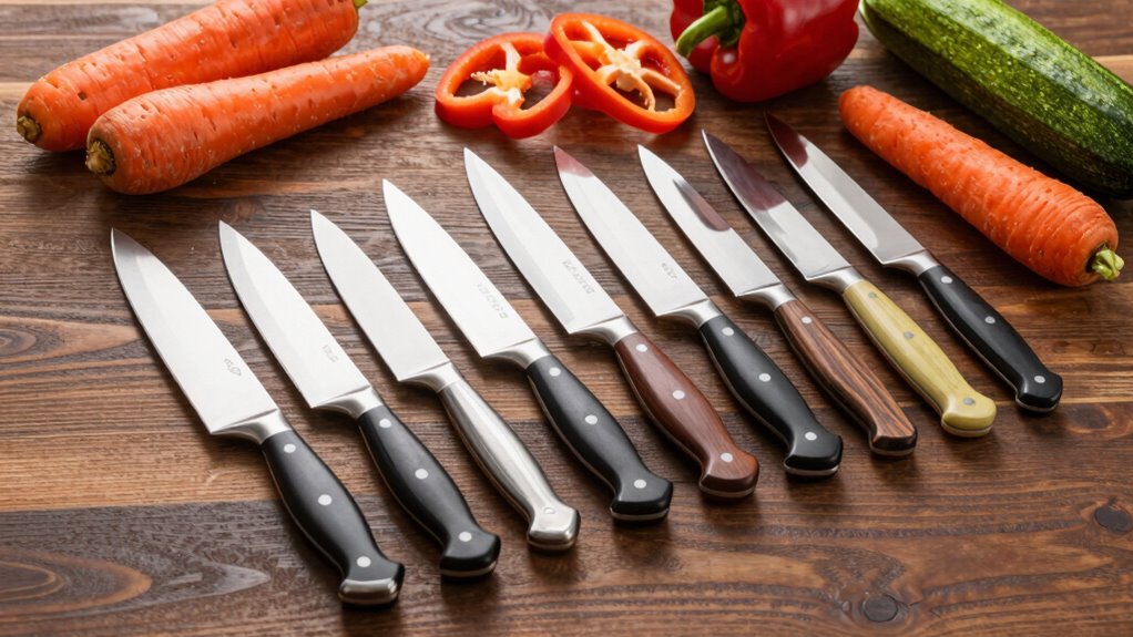When selecting a knife for vegetable prep, blade size and weight are critical factors that influence how comfortably and efficiently you can work. A blade of 6 to 7 inches strikes a good balance between control and speed, making it versatile for most tasks. Lighter knives, under 5 ounces, help reduce fatigue during prolonged chopping, allowing for better endurance. A well-balanced weight in your hand improves maneuverability and minimizes strain. Shorter blades excel at detailed cuts like julienne or fine dicing, offering greater precision. Conversely, heavier blades can add cutting power but demand more effort and control, especially for delicate slicing. Choosing the right combination of size and weight depends on your comfort and the types of vegetables you frequently prep.