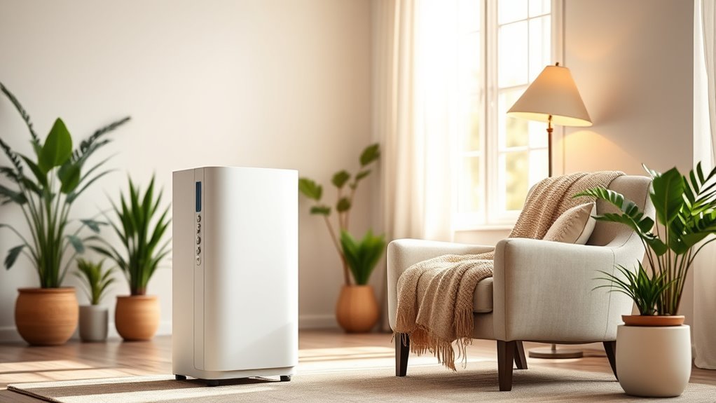Since seniors often sleep during air purifier operation, maintaining a quiet environment is essential; noise levels below 30dB are ideal to prevent sleep disruptions. Many HEPA purifiers include sleep modes that dim displays and lower fan speeds, creating a peaceful setting. Ultra-quiet sleep modes operate as low as 15-20dB—comparable to a whisper—ensuring minimal disturbance. Continuous low-noise operation allows seniors to breathe cleaner air overnight without stress or interruptions. Adjustable fan speeds and dedicated sleep modes give users control over noise levels, balancing effective purification with comfort. When choosing a purifier, prioritize models with sleep features that minimize sound, so you can rest peacefully knowing the air is clean without the noise compromising your sleep quality.