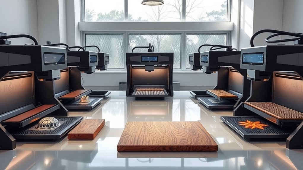 I believe vital safety features in top laser engravers include an automatic shut-off system if overheating occurs, a protective enclosure to contain fumes and prevent accidental exposure, and an emergency stop button for immediate power cutoff. Additionally, proper ventilation, eye protection shields, and sensors that detect smoke or fire are essential. These features guarantee user safety while maintaining peak performance and peace of mind during engraving projects.