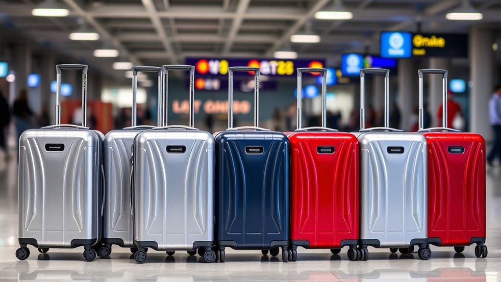 When evaluating lightweight 20-inch hardside carry-ons, maneuverability features play a crucial role in making travel easier. Four multi-directional spinner wheels that rotate 360° allow me to glide effortlessly in any direction, reducing strain during busy airports. The lightweight telescoping handle with push-button locks makes adjusting the height simple, ensuring comfortable control whether I’m wheeling or pulling. Double or multi-wheel systems boost stability, minimizing wobbling and making handling smoother. Rubber studs or feet at the base keep the luggage upright when stationary, preventing it from tipping over. Handles positioned on the top and side offer versatile grip options, making it easier to lift or maneuver in tight spaces. These features combined greatly enhance the ease and convenience of traveling with a lightweight carry-on.