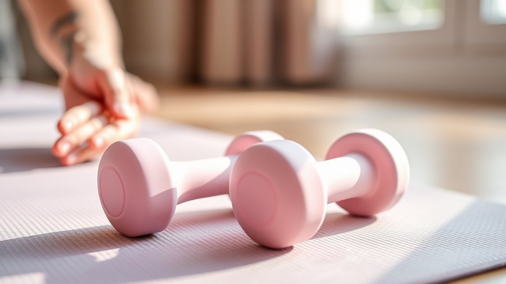 To prevent injuries with lightweight dumbbells, I always start with proper technique—think of it as building a strong foundation before the house. I focus on controlled movements, avoid rushing, and listen to my body’s signals. Stretching before and after workouts helps keep muscles flexible. If I feel pain or discomfort, I stop immediately. Consistency, patience, and paying attention to form are my best tools to stay safe.