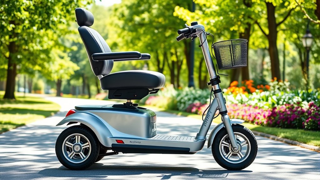 Have you ever struggled to lift or carry a mobility scooter? If so, weight and portability are vital factors. Lighter models, often under 40 lbs, make it much easier for seniors to handle on their own. Features like foldable frames and quick-disassembly designs boost portability, allowing effortless storage in car trunks, closets, or travel compartments. Keep in mind, the battery’s weight also affects overall portability; lightweight lithium-ion batteries help keep the scooter manageable. Heavier scooters, over 70 lbs, usually require assistance or ramps, which can limit independence. Compact, lightweight models provide convenience for daily activities, shopping, or travel, without sacrificing stability or safety. Choosing the right weight and portability features ensures you stay mobile and independent wherever you go.