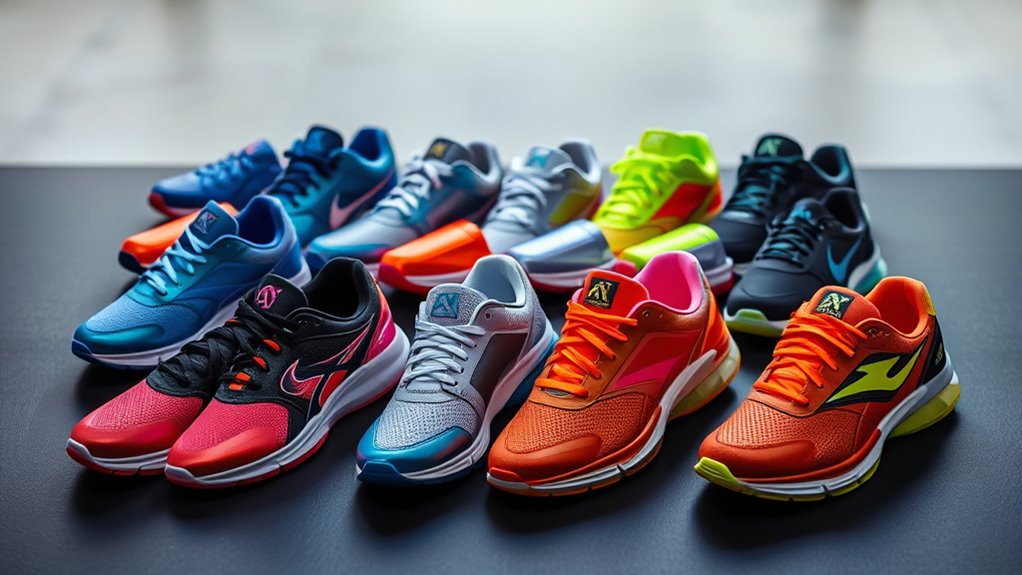 Choosing limited-edition athletic shoes requires careful attention to their materials, as durability plays a crucial role in making certain they withstand active use. I focus on materials like reinforced leather, high-density synthetic fabrics, and abrasion-resistant rubber outsoles, which are essential for longevity. Even premium materials can degrade if not properly designed or maintained, so I look for shoes with reinforced stitching, protective overlays, and sturdy sole construction. Durability testing data, such as abrasion resistance ratings and flex fatigue limits, give me objective insights into how well the shoes will hold up over time. Since limited runs often feature unique designs, selecting shoes made from robust materials ensures they maintain their structural integrity and look great, even after extensive wear.