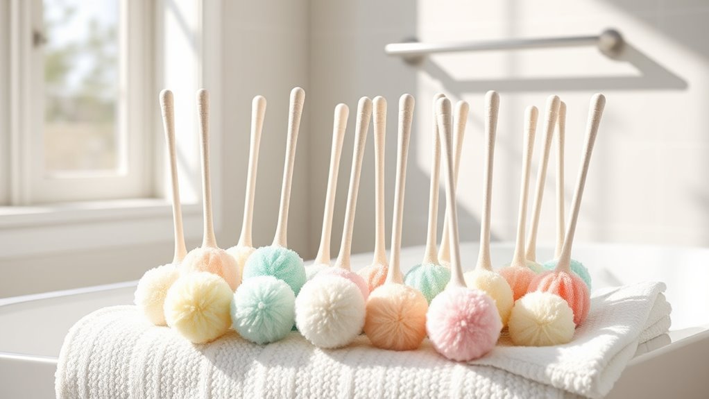 Although I love using my long-handled bath sponge, I know that keeping it clean and well-maintained is essential for my health. After each use, I always rinse and thoroughly dry my sponge to prevent mold and bacteria from growing. I’ve learned to replace my sponge every 3 to 4 months, or sooner if I notice any wear or unpleasant odors. To sanitize it, I use gentle cleaning agents or diluted disinfectants regularly. I also make it a point not to share my sponge with anyone, as that helps minimize cross-contamination. Finally, I store my sponge in a well-ventilated area, preferably hanging, to make certain it dries quickly and stays fresh for my next bath.