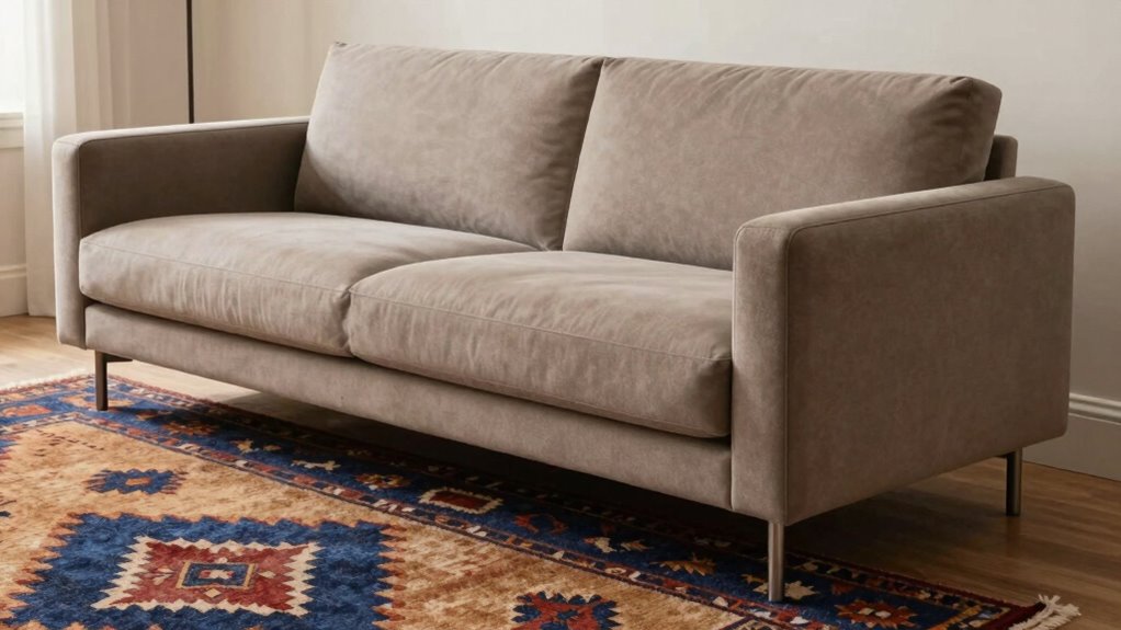 Choosing a low profile sofa that perfectly complements your rug starts with paying close attention to height compatibility. First, make certain the sofa’s height doesn’t exceed the rug’s clearance to prevent tripping hazards and maintain visual harmony. It’s also important to compare the seat height with the rug’s pile height, creating a balanced look. The overall height of the sofa should match the rug’s design to keep proportions in check, avoiding the sofa overshadowing the rug or making it seem lost. Additionally, consider how the sofa’s height relates to other furniture pieces nearby, ensuring comfortable and functional spacing. In the end, measure both the sofa and the rug to confirm they work together for seating comfort and aesthetic appeal, creating a cohesive and inviting space.